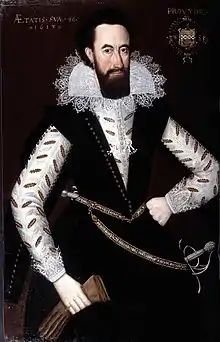 William Stewart became a gentleman of the king's bedchamber in May 1594. He helped save the king from the Gowrie Conspiracy at Perth on 5 August 1600 and James VI rewarded him with the forfeited Ruthven castle of Trochrie near Little Dunkeld and the barony of Strathbran.[5] A privy seal letter of November 1600 describes him as a "daily servitor" of the king.[6] He is said to have made additions to Trochrie Castle which featured his initials and heraldry.[7]