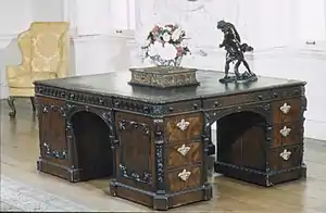 William Vile went into partnership with John Cobb in 1750 until he retired in 1765, operating from premises at the corner of St Martin's Lane (No. 72) and Long Acre, London. They were Cabinet-makers and Upholsterers to His Majesty (George III) from 1761 to April 1764,[3] based mainly on the superb quality of Vile's cabinet work and the individuality of his designs.[4] The partners were not known as great innovators, but their standard of craftsmanship was seldom equalled. One outstanding piece was a jewel cabinet of mahogany, inlaid with ivory and various woods and exquisitely carved, made for Queen Charlotte in 1761.[5]