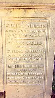 Williams married Sophia Wells, daughter of Samuel Wells, in 1811, in New Hartford. Their marriage brought fourteen children, several of whom died very young. Sophia died November 12, 1831.[7] Williams's son, Robert Stanton Williams, was born September 10, 1828, was the youngest surviving child of Sophia.[8] His second son, Samuel Wells Williams, named after Williams's father-in-law, was born September 22, 1812, who became a writer doing missionary work in China.[9] After the death of Sophia, Williams married again in 1833 to Catherine Huntington, the daughter of Hon. Henry Huntington of Rome, New York, a state legislator and the president of the Bank for Savings of the Village of Utica, the present day Bank of Utica.[10][11][lower-alpha 3] Williams had fourteen children by his first wife, and two by his second. He lost several children when they were in their infancy or adolescent years; Fredrick in 1814, Laura, in 1820, Julian and Harriet, in 1824, Alfred and Thomas in 1831.[13]