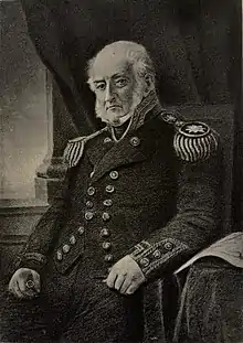 In the spring of 1842 the old wound received sixty years before at the storming of Fort Ostenberg opened and would not heal. The surgeons came to the conclusion that something must have remained in the wound, and, as the result of an operation, extracted a jagged piece of lead and a fragment of cloth. The wound, however, would not heal. Gradually losing strength, he died in London on 7 June 1842. He was then the senior admiral of the red. His wife had died several years before, leaving issue two sons and two daughters. His portrait, painted in Paris, in 1840, by Jules Laur, was inherited by his granddaughter.[3]