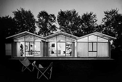 The Kessler House is located on a residential street amid traditional Tudor and Colonial Revival houses, and across the street from Beaumont Hospital.[3] It is a single-story, square plan structure with a light steel frame measuring 39 feet (12 m) by 42 feet (13 m). The most dramatic features of the house are the saw-tooth roof and the textured brick privacy fence that creates an enclosed garden along the front of the house.[3]