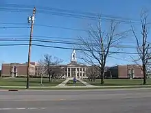 The building was designed by acclaimed local architect Duane Lyman, who was known as the dean of Western New York architecture.[5] Its construction features classic columns and a traditional clock tower. A science wing was added to the building's east side in 1961, and a new athletics wing was added to the north side in 1992.[5] An remodeled and expanded music wing was completed in 2021.[6] The building was added to the National Register of Historic Places (as "Williamsville Junior and Senior High School") in 2008.[7][8]