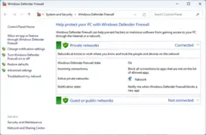 ![]() Windows Defender Firewall in Windows 11, reporting firewall is turned on and working normally. | |