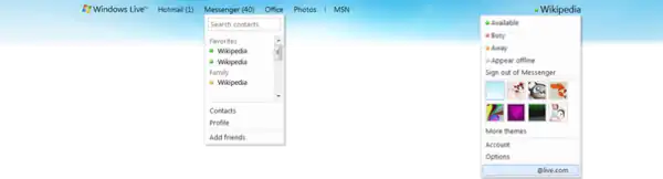 In addition to the themes provided in Windows Live Wave 3, the release of Windows Live Wave 4 provided additional themes for users to customize their pages on Windows Live, with several dynamic themes that changes according to the time of day and weather conditions at the user's location. Several of these newly added themes are similar to wallpapers originating from Windows 7.[19] In addition, the Windows Live Wave 4 header features a reorganized dynamic navigation menu that displays the number of the user's current online contacts and the number of unread e-mails,[20] as well as an in-built Windows Live Web Messenger service allowing users to connect to the Microsoft Messenger service and Facebook chat service to chat with their online contacts while browsing any Windows Live properties using a web browser.[21]