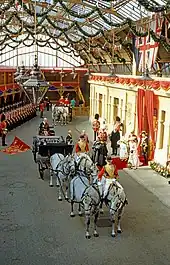 After leaving the platform, visitors could see the restored royal waiting room with figures of Queen Victoria and the Prince and Princess of Wales, before entering 'The Royal Parade' area. A walkway was constructed up and around the canopy, allowing visitors to view figures of the royal party exiting the waiting room and the queen boarding her Ascot landau. Over seventy wax figures of 2nd Battalion Coldstream Guards formed part of this scene.[15]