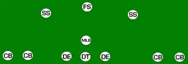 Defense consisting of seven (quarter) or eight (half dollar) defensive backs. The seventh defensive back is often an extra safety, and this defense is used in extreme passing situations (such as to defend against a Hail Mary pass). It is occasionally referred to as the prevent defense because of its use in preventing desperation plays. The cornerbacks and safeties in a prevent defense usually make a point of defending the goal line at the expense of receivers in the middle of the field.