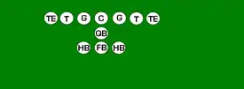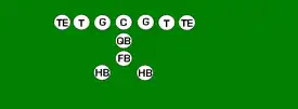One variation of the T Formation would be where all the running backs would be closer than usual, being at fullback depth rather than halfback depth. Another variation of the "balanced T" formation is the so-called "unbalanced T" formation.[2] In this configuration the line of scrimmage has an end and tackle left of center, while to the right of the center are two guards, a tackle, and an end. This creates a line that is weighted toward the right of the center. With the backfield lining up in the conventional T formation behind the center (quarterback, two halfbacks and fullback), the resulting configuration is "unbalanced" due to the asymmetry of the placement of the linemen. The "split T" spreads the offensive line out over almost twice as much ground compared to the conventional T formation. This causes the defensive line to also spread out, creating gaps the offense can exploit.[3]