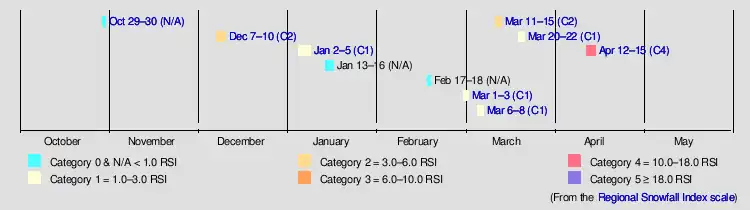 The end of January saw some scattered snow-related events, but a pattern change in February brought warmer conditions to most of the U.S., and thus few wintry weather events – except for one that struck the Northeast in mid-February. Unprecedented warmth days later sent temperatures as high as 80 °F (27 °C) on February 21 in the eastern half of the country.[17] By the turn of March, however, a major pattern shift occurred in which the same regions in the Northeast were hit by four consecutive rounds of nor'easters and heavy snow within a three-week period. This led places such as New York City and New Jersey to have a March that was cooler then the previous February.[18][19] The first one developed on March 1, and although the most severe damage was caused by flooding as well as snow, unusually high tides and storm surges along the coast, wind and downed trees caused massive inland power outages,[20] Days later, a second nor'easter developed and rapidly strengthened while bringing heavy snowfall to New Jersey and interior New York. The storm caused up to 1 million people to lose power. Hundreds of flights were cancelled across the region, and many schools closed due to the nor'easter. Several municipalities in the Philadelphia area declared snow emergencies and many schools and government offices were closed on March 7. Nearly a week later, a third nor'easter affected the New England coast with near-blizzard conditions and coastal flooding on March 13. Wind gusts of 47 mph (76 km/h) were reported at Logan International Airport in Boston while gusts reached 77 mph (124 km/h) on Nantucket Island, 79 mph (127 km/h) in Hyannis, and 81 mph (130 km/h) in East Falmouth.[21] A storm surge of 3 feet (0.91 m) was reported on Nantucket while a 2.8 feet (0.85 m) storm surge was recorded in Boston.[22] Over a foot of snow was reported in portions of New Hampshire,[22] with Deefield receiving almost 29 inches and Middleton reported 28 inches. No widespread power outages were reported.[23] The storm brought heavy snow and blizzard conditions to Maine on March 13. Blizzard conditions were reported in Portland. Over a foot of snow was reported in portions of the state.[22] The fourth and final nor'easter occurred on March 20 to 22, with its focus further south in the Mid-Atlantic. Some areas saw their heaviest late-season snowfall on record, and approximately 100,000 lost power as a result of the storm.[24]