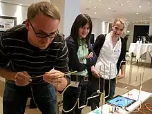 A wire loop game, or buzz wire, is a game which involves guiding a metal loop (a 'probe') along a serpentine length of wire without touching the loop to the wire.[1] The loop and wire are connected to a power source in such a way that, if they touch, they form a closed electric circuit. The circuit is connected to a light or sound-emitting device of some sort, so that when the loop and the wire touch, the light-emitting device will light up, and the sound-emitting device will make a sound, traditionally a buzzing noise. In commercial implementations of the game the wire is usually bent along a single axis.[1]