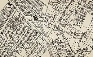 The line ran south through West Didsbury via a cutting, passing underneath Palatine Road. Withington & West Didsbury Station was situated on the north side of Lapwing Lane, set back from the road with a small forecourt area. The station building was a red brick Gothic Revival house, almost identical in style to other nearby stations of the period such as Didsbury. The building incorporated a booking hall, a parcels office, and ladies' and gentlemen's waiting rooms as well as a two-storey station master's house.[4] There were two platforms in the cutting with glass canopies and a footbridge.[2][3] Withington Town Hall, which stood opposite the station, was built for Withington Local Board around 1880–90.[7]