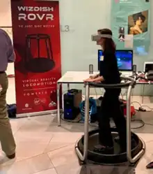 The ROVR consists of a round, concave, low friction platform and a plastic or metal frame for user support. The user slides their feet back and forward on the platform, in a reciprocating motion, to simulate locomotion whilst wearing shoe covers that are designed to reduce friction.[2] The soles of the shoe covers are coated in ceramic discs that reduce friction between the user's feet and the ROVR. ROVR Systems also sells shoes with ceramic discs already fitted.[3] A contact microphone in the ROVR's platform translates the sound of the user's feet moving into forward movement within virtual reality. A low level of noise, made by slow or small movements on the platform, becomes slow movement in virtual reality, whilst louder noises increase the speed of movement. [4] The user moves in whichever direction the head or hand controllers are facing, as the acoustic sensor system can not detect the movement direction of the feet or the orientation of the body. [5] The concave platform combined with reciprocating movement of the feet minimises vertical movement of a person’s centre of mass and so mimics the best low energy movement of real walking. It also encourages the user's feet to slip back into the centre of the ROVR, stopping the user from moving off the platform. A ring encircles the user at waist height, forming a containment field. This is for user support during orientation and to provide a boundary to stop the user from moving off the platform. Users quickly become used to the platform's surface, and are able to balance without the help of the ring, their hands being free to use independent controllers such as Oculus Touch, Vive wands, Knuckles and the Xbox One Controller.