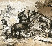 An Anglo-Saxon wolf hunt, as illustrated in The British wolf-hunters: A Tale of England in the Olden Time, an 1859 novel by Thomas Miller.