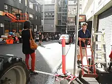 On October 8, 2012, production returned to Sydney with filming on Erskine Street near Cockle Bay.[73] The following week, the film shot in Parramatta, which doubled as a Japanese city.[74] Also in October, Mangold revealed that the film follows the events of X-Men: The Last Stand, saying, "Where this film sits in the universe of the films is after them all. Jean Grey is gone, most of the X-Men are disbanded or gone, so there's a tremendous sense of isolation for [Wolverine]".[75] He elaborated that his decision to have The Wolverine take place after The Last Stand without making it a direct sequel to that film stemmed from the simplicity of setting the story after the huge amount of adventures Wolverine has endured throughout the film series the possibility of choosing a perfect moment for Logan to be stripped of both his heroic duties and his sense of purpose like a rōnin due to several of his fellow X-Men dying in the third X-Men film, allowing him to live in a "separate" world that doesn't necessarily need to tie-in with the next film to allow for more creative freedom, and finding himself in an existential crisis due to his immortality, which Mangold felt that it sounded in accordance to the themes of the original arc by Claremont and Miller.[76] Mangold later stated that in the fight scenes, "there's an urgency and a kind of intensity and hand to hand physicality that I hope is a little different than everything else out there".[24] On October 25, 2012 production relocated to Sydney Olympic Park in western Sydney.[77] The set was made into a Japanese village draped in snow with filming beginning on November 1, 2012.[78] On November 10, 2012, filming took place on a back street in Surry Hills. The set, constructed on Brisbane St., was transformed to look like a Japanese street with Japanese signage and vehicles scattered throughout.[79] Principal photography concluded on November 21, 2012.[80]