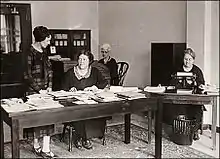 Women's clubs were very active in women's suffrage (see below) and helped support the war effort during World War I. Women in clubs raised money, worked with the Red Cross, financed the Home Guard and set up communications within the community to share information quickly.[24] Woman's clubs also knitted socks, rolled bandages for soldiers and sold war bonds.[44] In Texas, the Texas Federation of Women's Clubs (TFWC) helped create recreational canteens for soldiers.[45] During the 1930s, women's clubs hosted programs in concert with the Works Progress Administration.[46] When World War II broke out, women's clubs were involved in volunteering.[23]