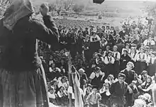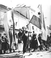 AFŽ councils sprung throughout the Partisan-liberated areas of Croatia.[1] Local councils reported to the regional, which were subordinate to the republic's council, which in turn answered to the federal council.[3] Initially the most active, and with extraordinary achievements in the war effort, was the regional AFŽ for Lika in Croatia proper. It succeeded in publishing the first wartime women's journal, Žena u borbi ("Woman in the Struggle"), in the midst of the 1942 counter-insurgency Operation Trio. The journal turned out to be very effective in mobilising the women of Lika, and served as an example for other wartime journals issued by various AFŽ forums.[1]