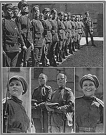 In the spring of 1917, Kerensky, the Russian Ministry of War authorized the creation of sixteen separate all-female military formations. Four were designated as infantry battalions, eleven slated as communications detachments and a singular naval unit.[1] Already some women had successfully petitioned to join regular military units, and with the planning of the Kerensky Offensive, a number began pressing the new Provisional Government to create special women's battalions.[1] These women, along with a number of high-ranking members of the Russian government and military administration, believed that female soldiers would have significant propaganda value, their example revitalizing the weary and demoralized men of the Russian army.[2] Simultaneously, they hoped the presence of women would shame hesitant male soldiers into resuming their combat duties.[3][2]