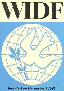 WIDF regarded peace as a prerequisite for fighting against fascism and obtaining rights for women and children.[28] Peace as seen by WIDF members, unlike the pacifist stance of the western feminist groups, was not an avoidance or absence of war, but could only be attained if social justice was achieved,[27] and oppression and exploitation ceased.[29] The organization strongly supported decolonization and national independence movements, and was active in the anti-war movement pushing for peace in Africa and Asia.[28] WIDF organized its activities directly with its women members, bypassing government officials. It was typical for the organization to send letters to members urging action and protest over government policies.[30] For example, the organization rallied Frenchwomen to have their sons refuse to participate in colonial wars,[31] and urged American women to protest the use of germ warfare in Korea.[30] Between its congresses, WIDF also organized large conferences to address peace, motherhood, and women's issues.[30][32]