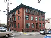 After the great quake and fire, Julia Morgan designed the replacement residence, a new three-story brick building with accommodations for 60 to 70 girls -- orphaned, rescued or abandoned. It was built at 940 Washington Street in San Francisco Chinatown and was dedicated by the Women's Home Missionary Society in 1912.[4] Meanwhile, the Chinese Methodist Church was rebuilt in 1911 on the corner of Washington and Stockton Streets at 920 Washington Street.[5] Later in the 1940s, the three-story brick building at 940 Washington Street, designed by Julia Morgan for the "Oriental Home", was renamed the Gum Moon Women's Residence.[6]