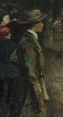 ![]() Women's Reserve Ambulance Corps members and ambulance (with green cross markings) at Victoria Station, London in a 1918 painting | |