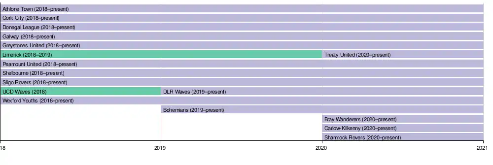 The inaugural season consisted of 11 teams and began mid-late July 2018 with a truncated season with two groups. Competing in Group One were: Athlone Town, Donegal League, Peamount United, Shelbourne, Sligo Rovers and Galway Women's and competing in Group Two were: Cork City, Greystones, Limerick, UCD Waves, and Wexford Youths.[2] Following the conclusion of the 10 rounds of fixtures, the top two teams from each group played in play-off mode the semi-finals and final to decide the winner.[3] [4]