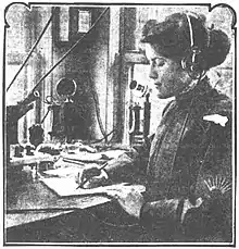 Beginning in the late 1840s, women were employed as landline telegraph operators, sending and receiving Morse code messages. Early radio communication, then called "wireless telegraphy", was developed in the late 1800s, and also initially communicated using Morse code. Women were employed as some of the earliest wireless operators, and in early 1901 the announcement of the inauguration of a Hawaiian inter-island overland system noted that four of the fourteen operators were women.[2] In 1906, Anna Nevins, who had been a landline telegrapher for Western Union, began work as a wireless operator for Lee de Forest's station "NY", located at 42 Broadway in New York City. She was later employed at the United Wireless Waldorf-Astoria Hotel station in New York City.[1] Nevis left the profession after she married "NY" station manager H. J. Hughes in July 1910.[3]