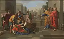 In the Book of Samuel, Bathsheba is a married woman who is noticed by king David while she is bathing. He has her brought to him, and she becomes pregnant. The text in the Bible does not explicitly state whether Bathsheba consented to sex.[63][64][65] David successfully plots the death of her husband Uriah, and she becomes one of David's wives.[63] Their child is killed as divine punishment, but Bathsheba later has another child, Solomon. In the Book of Kings, when David is old, she and the prophet Nathan convince David to let Solomon take the throne instead of an older brother.[66]