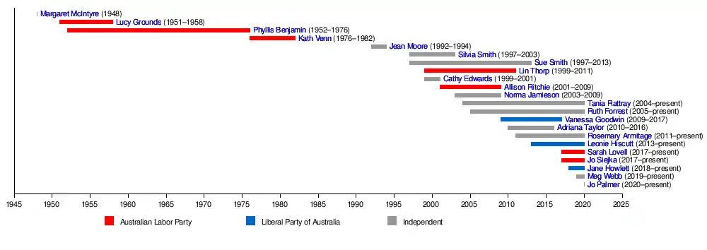 | 3 | Phyllis Benjamin | Labor | Hobart | 10 May 1952 – 22 May 1976 (retired) |
