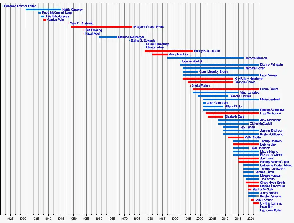 This article covers the history of women in the United States Senate and various milestones achieved by female senators. It includes a list of all women who have served in the Senate, a list of current female senators, and a list of states represented by women in the Senate. The first female U.S. senator, Rebecca Latimer Felton, represented Georgia for a single day in 1922, and the first woman elected to the Senate, Hattie Caraway, was elected from Arkansas in 1932. Sixty women have served in the upper house of the United States Congress since its establishment in 1789. As of October 3, 2023, there are 25 women (15 Democrats, 9 Republicans, and 1 Independent) serving as U.S. senators.