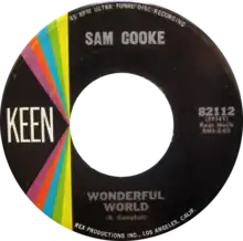 Cooke signed to RCA Victor in 1960 but his first two singles on the major label – "Teenage Sonata" and "You Understand Me" – failed to register on the charts.[4] Meanwhile, John Siamas, co-founder of Keen Records, discovered the "demo" recording of "Wonderful World" among unreleased Cooke recordings.[4] Keen released "Wonderful World" in competition with RCA's issue of "You Understand Me" in the same week.[4] "Wonderful World" quickly became Cooke's best-performing single since his first hit "You Send Me", reaching number 12 on the Billboard Hot 100 and number two on the magazine's Hot R&B Sides chart.[4] Billboard reviewed the single upon its release, giving it four stars and writing, "Moderate rocker gets a smooth belt from Sam Cooke in his usual, salable style."[5]