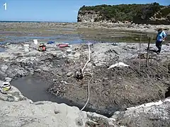 The Wonthaggi Formation was deposited within Gippsland Basin, which formed part of a extensional rift valley system between Australia and Antarctica. The lithology primarily consists of fluvially deposited siliciclastics derived from volcanic rocks of the Whitsunday Silicic Large Igneous Province to the East, with suggestions that the sediments either originated from braided river and sheet flood deposits, or meandering river systems on vegetated floodplains.[3] The age of the formation is thought to be Valanginian to Barremian, with the Flat Rocks site being late Barremian (~125 Ma) in age, older than the sediments from the Eumeralla Formation, which are thought to be Aptian-Albian in age.[3]
