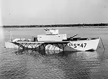 Was used to provide landing support by firing rockets before the beach assault. Landing Craft Support Medium, LCS (M)(3). There was a later improved design with a pointed bow for better speed. Range 90 miles at top speed of 9 knots. A length of 41 feet, a beam, of 10 feet. Displaced 11.4 tons lite and 12.8 tons loaded. A draft of 1-foot 6 inches forward and 2 feet 11 inches aft. Armed with two 50 twin power-operated Vickers M.G., two .303 Lewis guns, one 4-inch smoke mortar. Had twelve Type 18 smoke generators. To protect wood hull had DIHT steel plating on hull sides and deck, bulkheads, and on conning tower and ammunition hoist. Had a crew of 1 officer, 3 men, 6 gun crew. Powered by two Ford V -8 Scripps gasoline engines with 65 hp each. Held 98 gals. of gasoline.[110]