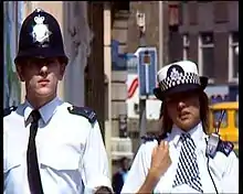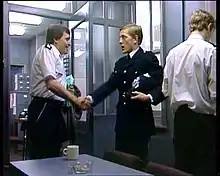 "Woodentop" has an unusual place in the history of The Bill due to the original premise of this being a one-off play. After broadcast, Thames commissioned a full series to be shown the following year, under the name The Bill as the show had the potential to appeal to a mass audience. Although The Bill is clearly a continuation from this episode, the main series contradicts it in a number of ways. For instance, in Woodentop Litten has completed his secondment to CID[4] and is close to securing his place in the detective branch, whereas in The Bill he does not gain his CID secondment until halfway through Series One. In addition many central characters in "Woodentop" - such as Sergeant Wilding and Inspector Deeping - vanish between the pilot and the series. Deeping does gain one mention in Series One, in the episode "It's Not Such a Bad Job After All", where Ackland is informed that he is coming to meet her on the scene of a suicide - a later radio transmission, however, reports that Sgt. Bob Cryer is to meet her instead. Although Wilding is not mentioned following Woodentop, he shares several characteristics with Sgt. Cryer - including a position as the "father figure" of the Sun Hill relief, and an apparently tumultuous relationship with Roy Galloway, whom both Cryer and Wilding refer to as a "bloody superstar". In the first episode of Series One, "Funny Ol' Business - Cops and Robbers", Galloway and Cryer make apparent reference to the events of Woodentop in regards to Jim Carver. Galloway suggests that it is Cryer who requested the favour, further suggesting that Cryer and Wilding are in fact the one character, and that, like PC Taffy Morgan (later Taffy Edwards), Jack Wilding's name has merely been changed to Bob Cryer. There are also discrepancies with the naming of some of the characters. In the 2003 live episode of The Bill, made to celebrate the twentieth anniversary of broadcast, Carver and Ackland discuss events from the pilot, whereupon Carver incorrectly refers to the character of Taffy by the surname Morgan, a name that was dropped for the series proper in favour of "Edwards".[5] There are also mistakes made in some of the uniforms the cast wore during the episode, for example, in one scene, PC Dave Litten is on foot patrol with PC Jim Carver, and PC Litten's helmet has GR on the helmet badge where it should have had ER, the same that was on PC Carver's helmet. Also the tunics the male officers wore had notched lapels with buttoned down epaulettes, whereas they should have just had peaked lapels and the epaulette's insignia placed on the shoulder of the tunic as this is what the Metropolitan Police wore at the time. Only four of the cast of "Woodentop" would go on to be regulars in the main series of The Bill: Mark Wingett, Trudie Goodwin, Gary Olsen and Colin Blumenau, while a number of characters were re-cast, including Roy Galloway.[6]