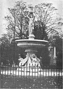 In 1887, two fountains were constructed in the southern half of Woodland Cemetery. A fountain for the cemetery had first been approved in 1864,[48] with cemetery officials setting aside the circle closest to the Woodland Avenue gate for the structure.[57] In 1866, the city council's Committee on Parks and Public Grounds studied the issue of adding fountains and ponds to the cemetery,[59] and approved of both. (The committee even recommended that wastewater from the larger fountain be used to support water to a fish pond anticipated for construction to its east).[17] No work had been undertake by 1869, when cemetery trustees again pushed for fountains and a pond.[83] Why the cemetery or city council decided to finally authorize fountains in 1886 is unclear. The artist chosen to design the fountains was George Rackle,[lower-alpha 15] a German immigrant who had gained fame as a sculptor of marble and granite funerary monuments in Columbus, Ohio. Rackle had recently moved to Cleveland, and in 1885 his design for a centaur-and-dolphin fountain for the lagoon in Wade Park in Cleveland was unveiled 1885 to great acclaim.[120] The popularity of the Wade Park fountain led officials to hire Rackle to craft two fountains for Woodland Cemetery. The first fountain was approved in October 1886,[121] and cemetery trustees added a second one in January 1887.[93]