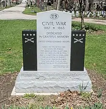 The American Civil War had a major impact on Woodland Cemetery.[1] On March 18, 1862, the Cleveland City Council donated a cemetery lot for the burial of Union soldiers killed in the war.[37] In 1863, the U.S. federal government purchased a 28-by-23-foot (8.5 by 7.0 m) lot in Section 14 to accommodate 16 Union dead. It purchased a second lot, 40 by 16 feet (12.2 by 4.9 m), in Section 10 in 1868 for the burial of 32 additional Union dead.[38][lower-alpha 8]