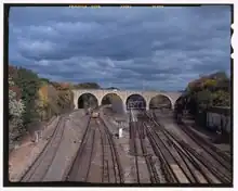 The New York and Harlem Railroad laid tracks through Woodlawn during the mid-1840s as part of their effort to expand the line to Tuckahoe. A March 17, 1848 agreement gave the New York and New Haven Railroad trackage rights over the NY&H from Williamsbridge south into New York City. Service was shared by the NY&H as well as the NY&NH, which was merged with the Hartford and New Haven Railroad to form the New York, New Haven and Hartford Railroad in 1872, and the trackage rights along the Harlem Division remained intact.[2] Throughout the late-19th Century, the Harlem Division was widened and rebuilt into an open cut line as part of a grade elimination project, and Woodlawn Station was one of several in the Bronx that were rebuilt with a station house on a bridge over all four tracks, including Fordham, Melrose, the former Morrisania and Tremont stations.[3] The expansion of the line in the Bronx, prompted the New York Central and New Haven Railroads to convert the Woodlawn Junction into a flyover bridge between 1910 and 1915. Modifications were made to the junction in later years, most recently by Metro-North in 1986.