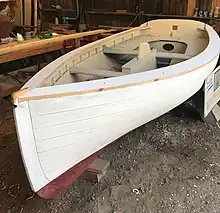 Despite clear influences from earlier Newport Point boats or even the earliest gaff-rigged catboats, many features of the Woods Hole spritsail boat—except most notably its transom—were derived from the construction designs embodied in the typical whaleboat from the region,[36] including carvel planking made of white cedar, frames of white oak jogged over internally cedar-battened seams, lapped sheer strakes, and oak knees that supported cross thwarts and stern seats. Knees also were used to attach the transom to the sheer clamps and between the frames and thwarts and benches located aft.[21]