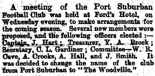 The club changed its name from Port Suburban to "The Woodvilles" at a meeting held at the Ford's Hotel on Wednesday 11 May 1870. J. Hart was elected Captained.[3]