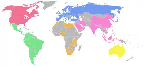 The WPA members are grouped by six continental/regional confederations, who in turn, consist of members from a country's national federation. The chart and table shows the WPA's members as of September 2022:[2]