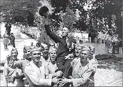 In September 1944 the Soviet Union declared war on Bulgaria and occupied part of the country. A coup d'état on 9 September led to Bulgaria joining the Soviets.[98][99] A day earlier Bulgaria had declared war on Nazi Germany. This turn of events put Bulgarian divisions stationed in Macedonia in a difficult situation. German troops had closed round them, while their command was being nonplussed by the high treason of some staff officers, who had deserted to the German side. The withdrawing Bulgarian troops in Macedonia fought their way back to the old borders of Bulgaria.[100] Josip Broz formed relations with the new pro-Communist authorities in Bulgaria.[101] After Bulgaria switching sides to the Allies negotiations between Tito and the Bulgarian Communist leaders were organized in September–October 1944, resulting in a military alliance between the Yugoslav forces and Bulgaria.[102][103] That was followed by demobilization of the Macedonian recruits, who formed as much as 40% – 60% of the soldiers in some Bulgarian battalions.[104] As a result, the Gotse Delchev brigade was set up and equipped in Sofia by the Bulgarian government providing the basis for the deployment of considerable Yugoslav troops in Vardar Macedonia.[105]