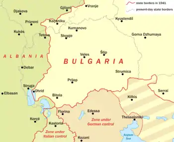 ![]() Map of Vardar Macedonia during World War II. The area was divided between Albania and Bulgaria and the frontier between them run approximately along the line: Struga – Tetovo – Gjilan – Vranje. (3 years, 7 months, 1 week and 5 days) | ||||||||