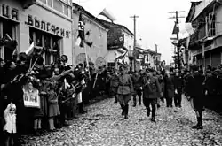 Bulgarian action committees – After the defeat of the Yugoslav army, a group of Macedonian Bulgarians headed by Spiro Kitincev arrived in Macedonia and started preparations for the coming of the Bulgarian army and administration in Macedonia.[41] The first of the Bulgarian Action Committees was formed in Skopje on 13 April 1941. Former IMRO[42][43] members in Vardar Macedonia were active members of this committee. On 13 April 1941, at a meeting in Skopje, it was decided that one of the first tasks of the newly formed organisation was to regulate the relations with the German authorities.[44] When the Bulgarian Army entered Vardar Macedonia on 19 April 1941, they were greeted by most of the local population as liberators, as anti-Serbian and pro-Bulgarian feelings among the local population prevailed at that time.[44][45][46][47][48] With the intercession of the committees and Bulgarian administration more than 12,000 Yugoslav Macedonian POWs who had been conscripted into the Yugoslav army were released by German, Italian and Hungarian authorities.[49] With the arrival of the Bulgarian army mass expulsion of Serbian colonists from Vardar Macedonia took place.[50] Once the region and administration became organized, the Action Committees became marginalized, and were ultimately dissolved.[51]