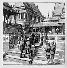 After India, Grant toured Burma, Singapore, After that, Grant traveled to Siam (Thailand) and met King Chulalongkorn of Siam at the Anantasamakhom Throne Hall (Old One) in the Grand Palace. Grant described him as a swift, energetic, and profoundly intelligent man, and Grant rested in Siam for a week and continued his journey to Cochinchina (Vietnam).[95] Leaving Hong Kong, the Grants visited Canton, Shanghai, and Peking, China, where he criticized the autocratic attitude of Westerners living in China toward the Chinese, comparing it to that of former slave owners toward freedmen striving for independence.[96] He declined to ask for an interview with the Guangxu Emperor, but did speak with the head of government, Prince Gong, and Li Hongzhang, a leading general.[97][98] They discussed China's dispute with Japan over the Ryukyu Islands, and Grant agreed to serve as a mediator saying "any course short of national humiliation or national destruction is better than war.".[99] After crossing over to Japan on USS Richmond and meeting the Emperor Meiji Grant, keeping his word, tried to convince Japan to make peace with the Chinese suggesting the formation of a joint commission to settle the disputed territory. Although the commission never materialized, Grant's on spot diplomacy diffused the situation.[100] Grant became the first ex-president to engage in personal diplomacy abroad.[101] Japan annexed the disputed islands a few weeks after Grant left the country.[102]