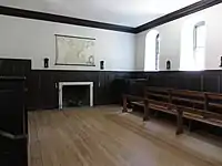 The Wren Building is the oldest extant building constructed for use by a college or university in the United States,[8][9] ahead of runner-up Massachusetts Hall at Harvard.[10] The Wren Building, previously known simply as "The College" or "The Main Building" was effectively the school's only academic building until the completion of the Brafferton building and President's House in the 1720s and 1730s. The campus only began its westward expansion in the first part of the twentieth century. Students studied, attended religious services, and lived in the Wren Building. In addition, at least eight students brought their enslaved people at the cost of room and board.[11] After the destruction of Virginia's former capital of Jamestown, Virginia's legislature met in the building's Great Hall as a temporary meeting place from 1700 to 1704 while the Capitol was under construction. In fact, the College was critical to Williamsburg becoming the new capital of Virginia after William & Mary students made speeches on May 1, 1699 from the College Building about how they would help build the town to its full potential.[12] When the Capitol burned in 1747, the legislature moved back into the building until the Capitol was reconstructed in 1754. The building also housed a grammar school and an Indian school, which was moved to the Brafferton building, in 1723. The building was used as a military hospital by the French during the American Revolutionary War and by the Confederacy during the American Civil War.