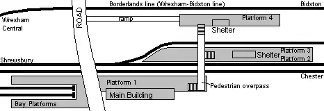 - Platform 3 can accommodate a 7 car train,[8] and was used for regular passenger services to London Marylebone via Shrewsbury, Telford Central and Tame Bridge, operated by Wrexham & Shropshire. This platform is now used by a small number of Borderlands Line passenger services (usually the first northbound and last southbound train each day), for services terminating at Wrexham from Shrewsbury and for freight services changing between the Shrewsbury-Chester line and the Borderlands line. This platform is signalled bidirectionally, so trains can depart either south towards Shrewsbury or north towards Bidston, although no services from Shrewsbury currently depart on the Borderlands line and vice versa. In practice this platform is used for trains terminating from either direction.