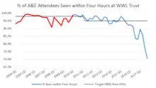 WWL has not met the NHS four-hour A&E target since October 2015. However, the latest figures, from May 2018, show that the Trust only just fell below the 95% target, with 94.3% of patients seen within four hours, compared to the national average of 90.4%. This ranked WWL 25 out of 133 trusts.[2] In 2022 it was reported that it was “increasingly common” for patients to die in the accident and emergency department. The report said "Of the 72 patients in A&E as I write this, 16 have been there over 24 hours and 34 over 12 hours. The longest stay is almost 48 hours."[3]