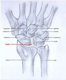 Scapholunate advanced collapse (SLAC) is a predictable pattern of wrist osteoarthritis that results from untreated long-standing scapholunate ligament rupture and the associated carpal malalignment.[4] The misalignment is described as dorsal intercalated segment instability (DISI) which is where the lunate angulates towards the dorsal side of the hand.[2][5]