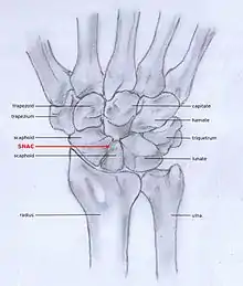 - 1 2 3 4 5 6 Shah, CM; Stern PJ (2013). "Scapholunate advanced collapse (SLAC) and scaphoid nonunion advanced collapse (SNAC) wrist arthritis". Curr Rev Musculoskelet Med. 6 (1): 9–17. doi:10.1007/s12178-012-9149-4. PMC 3702758. PMID 23325545.