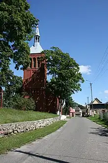 The red brick church with belfry and tower is a neo-Gothic building from the 19th century and was built on the foundation walls of the predecessor church. It was consecrated on 9 December 1868.[6] Several liturgical objects (brass baptismal bowl, altar chandelier) and wooden figures (Mary, Paul, etc.) were still present from the previous church. Before 1945, there was a ceiling painting above the altar: in a sky decorated with stars, an angel in light blue robes and waving a peace sash with the saying: Ehre sei Gott in den Höhen und Friede auf Erden unter den Menschen, an denen Gott ein Wohlgefallen hat. (Glory to God in the highest, and on earth peace among men with whom He is pleased.)[6][5] The altar was decorated with stars.