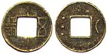During this era various nicknames for cash coins were given by the people which include the "Auspicious cash coins" (吉錢, jí qián) as well as the "Heavenly Pillar" (天株) cash coins, it is unknown what these cash coins were but it's speculated by Gary Ashkenazy that they were variants of the Yongan Wuzhu cash coins, according to Gary Ashkenazy the "Auspicious cash coins" were very likely to have been Yongan Wuzhu's that had the Hanzi character for "earth" (土) on the reverse side of the coin above the square center hole.[9] The nickname would then be derived from the fact that the square center hole resembles the Hanzi character "口" and as the "土" would be above it they together would look like "吉" meaning "auspicious". According to Gary Ashkenazy the "Heavenly Pillar" cash coin may have also been a variety of the Yongan Wuzhu which has a "dot" (dots represent "stars" (星) on Chinese cash coins) in the lower right part of the obverse side of the coin.[9] When the "Heavenly Pillar" cash coin is held upright it would point towards the sky or "heaven" (天).[9] The "star" in this particular case can also be referred to as a "pillar" (株) because it is cylindrically shaped and appears to rise up from the surface (肉) of the Yongan Wuzhu cash coin.[9] Another variant of the Yongan Wuzhu is also known as the "four corner" (si chu 四出) cash coin because it has 4 diagonal lines thar extend outwards from the corners of the square center hole all the way to the reverse rim of these Yongan Wuzhu coins.[9]