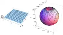 The unit sphere S2 in three-dimensional space R3 is the set of points (x, y, z) such that x2 + y2 + z2 = 1. Let N = (0, 0, 1) be the "north pole", and let M be the rest of the sphere. The plane z = 0 runs through the center of the sphere; the "equator" is the intersection of the sphere with this plane.